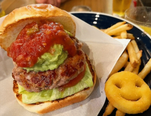 埼玉県飯能市、東飯能駅から徒歩約9分の街角に位置するジョージズ・バーガーは、1960年代アメリカ風レトロインテリアのハンバーガー&バーです。カウンター越しにシェフの技を眺め、オールディーズBGMが流れるゆったり空間。テラス席はペット同伴可です。100%ビーフ粗挽きパティをジューシーに焼き、天然酵母バンズで挟んだアボカドチーズバーガーやガーリックバーガーが人気。フライドポテトやオニオンリングもカリッと香ばしいです。ディナーはウィスキー100種以上、カクテル、プレミアムビールが充実。デザートにチーズケーキやブラウニーも。ランチから夜まで活躍するカジュアルスポットです。