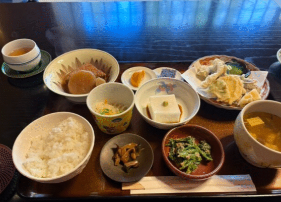 窓の外には広々とした庭園が広がり、その景色を眺めながら過ごす時間はまさに高野山ならでは。個室もあり、ゆっくりとした時間を過ごせるのも魅力です。観光の途中で落ち着いて食事やカフェタイムを楽しみたい方にぴったりの一軒です。