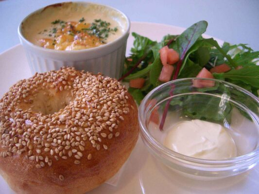 「R-fact.」は、ベーグルプレートやエビとアボカド丼、タコライスなど、多彩なランチメニューが揃う能代の人気カフェ。明るく広々とした店内は過ごしやすく、奥には畳の座敷席もあるため、子連れやグループでの利用にも重宝されています。