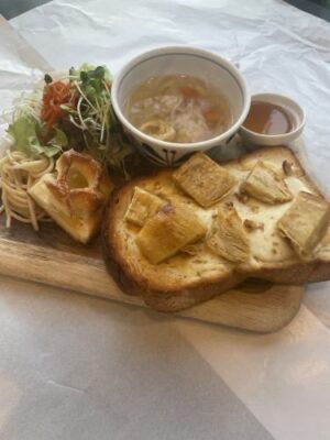 人気の「ハム&チーズ&明太子ホットサンド」は、外はカリッと中はとろりとした食感が楽しめる看板メニュー。スープやトーストが付いたセットもあり、バランスよく食べられると好評です。本に囲まれた静かな時間と、丁寧に作られた軽食を味わえる高知市の癒し系カフェです。