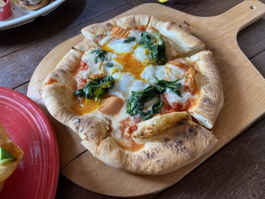 看板メニューの「マルゲリータピザ」は、薪窯ならではの香ばしさともちもち生地が絶品。また、濃厚な味わいが楽しめる「焼きカレー」も人気メニューで、リピートしたくなる味と評判です。自然に囲まれた開放的な空間で、ゆっくり過ごしたい日にぴったりのカフェです。