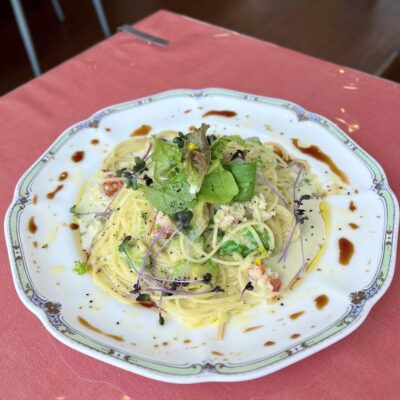 特に評判の「海老とアボカドのわさびクリームパスタ」は、ぷりっとした海老とまろやかなアボカドに、わさびの爽やかな風味がアクセントになった一皿。ほかにも、コクのあるミートソースパスタや、濃厚チーズが香るトマト系パスタなど、満足感たっぷりのメニューが揃います。旅の途中でしっかり食事を楽しみたいときにもおすすめのカフェです。