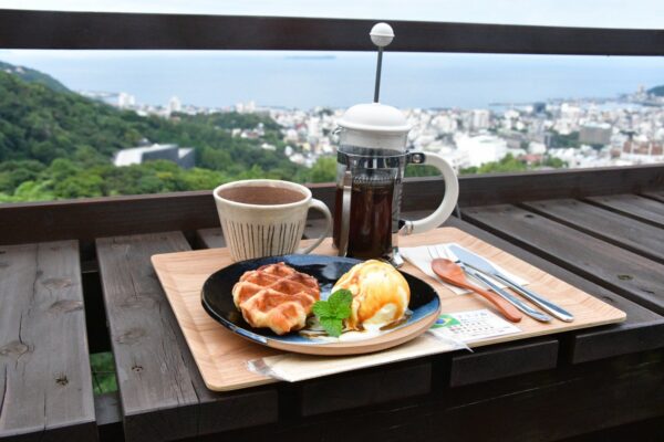 人気のワッフルは、外はさくっと中はふんわりとした食感が魅力で、丁寧に淹れられたコーヒーとの相性も抜群。「無花果のパウンドケーキとタンザニア珈琲」など、素材にこだわったスイーツも好評です。景色とともに味わう一杯が、心に残る特別な時間を演出してくれます。