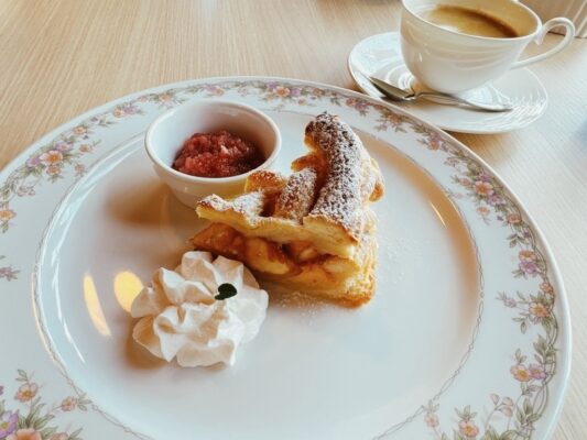 アップルパイはテイクアウトも可能なため、ドライブ途中のおやつやお土産にもおすすめ。ホットサンドなどの軽食メニューも揃っており、ランチ利用にも対応しています。伊豆高原散策の合間に立ち寄りたくなる、心和むカフェです。