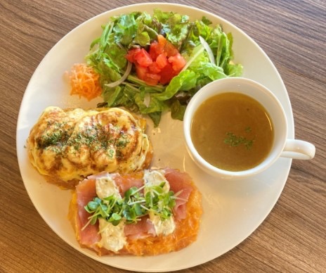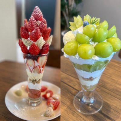 看板メニューのフレンチトーストは、食事系からスイーツ系まで種類が豊富。「ツナとクリームチーズのフレンチトーストプレート」や、「シャインマスカットパフェ」「いちごのクリームチーズパフェ」なども人気で、見た目の華やかさも魅力です。旬のフルーツを使ったメニューを目当てに、何度も訪れたくなる石和の定番カフェです。