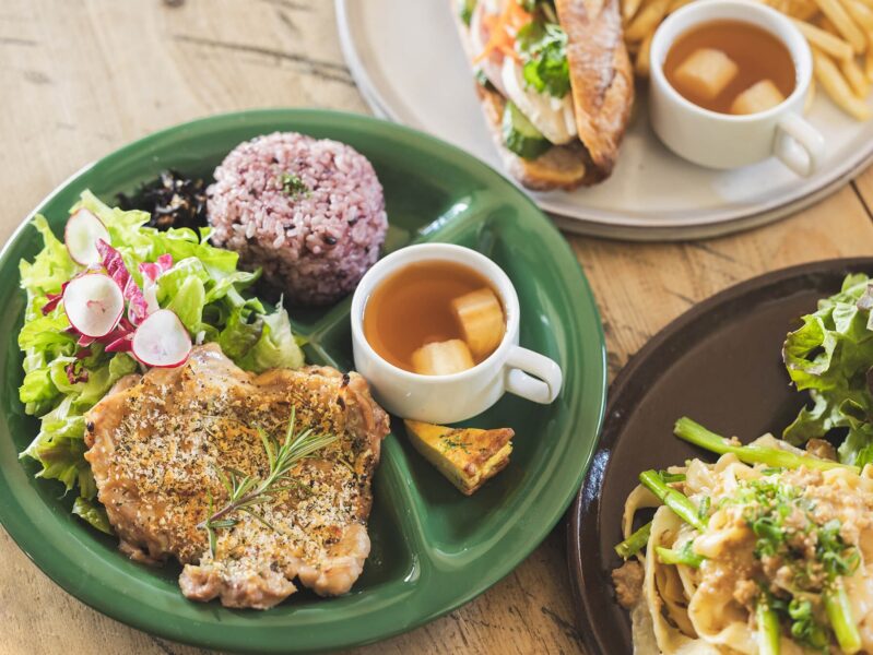 ランチタイムには、オーガニック野菜を使ったサラダが付く「日替わりランチごはん」が人気。デザートでは「生チーズケーキ」や、数量限定の「いちごパフェ」など、スイーツ目当てで訪れる人も多い一軒です。テイクアウトや予約にも対応しており、さまざまなシーンで使い勝手の良い、石和を代表するカフェです。
