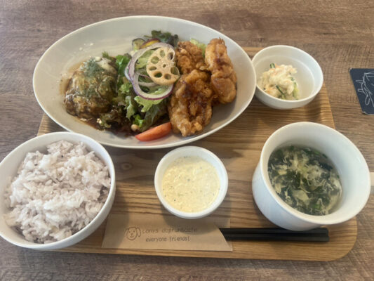 人気メニューは「ハンバーグとチキン南蛮」や「お子様ランチ」。しっかりとした食事内容で、幅広い世代に利用しやすい構成です。先にオーダーと支払いを行うシステムのため、スムーズに利用できるのもポイント。トイレにはベビーベッドが設置されており、子ども連れでも安心して立ち寄れる配慮がされています。