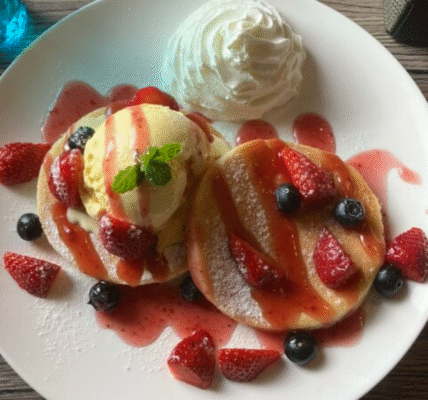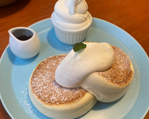 看板メニューは、ふわふわでしゅわっと軽い食感のパンケーキ。プレーンはもちろん、季節のフルーツを使ったものやブルーベリーソースを添えたタイプなど、見た目も楽しいスイーツ系が人気です。ランチタイムには、フライドチキンやポテト、ソーセージが付いたプレートもあり、甘いものと食事のどちらも楽しめます。コーヒーやカフェラテ、季節限定ドリンクも揃っていて、友達とのおしゃべりにも、ひとりでのんびり過ごす時間にも向いているカフェです。