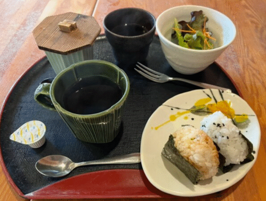 東区の文化のみちエリアにある、和風モーニングが人気の和カフェです。朝7時30分から10時まで提供されるモーニングは、ドリンク代のみでトースト、おにぎり、冷やし茶漬けの3種類から選べ、さらに茶碗蒸しとサラダがセットになった充実の内容です。特におにぎりモーニングは、青菜と胡麻が和えられた小ぶりのおにぎり2個に、具だくさんの茶碗蒸しとサラダがついた和風スタイルで、朝はごはん派という方に人気です。天井が高く落ち着いた店内は木の柱が特徴的な和モダン空間で、緑に囲まれたテラス席ではペットとの同伴も可能です。文化のみち二葉館のすぐ近くという立地で、散策の休憩にもぴったりの和カフェとして、多くの人々に愛されています。