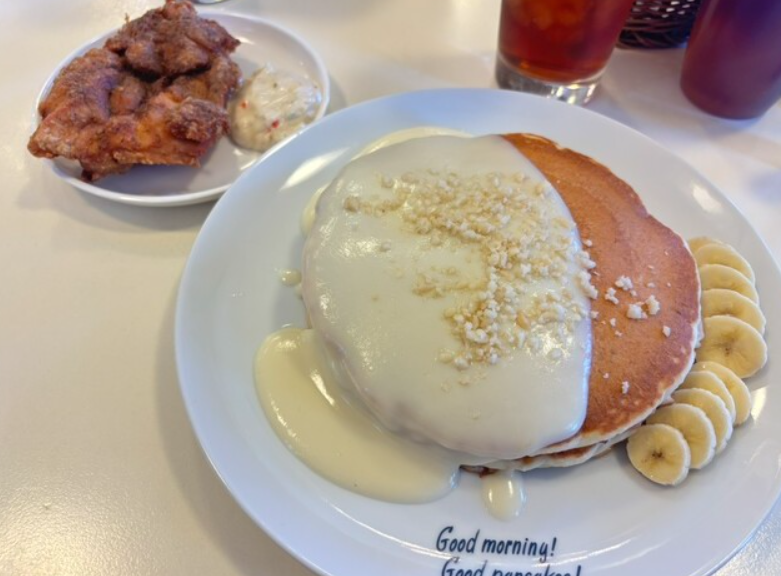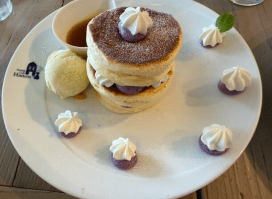 恩納村瀬良垣の国道58号線沿いにある、本格的なハワイアンパンケーキの専門店です。朝7時から営業しており、バターミルクをふんだんに使ったもちもちふわふわの食感が特徴のパンケーキを提供しています。一番人気は数量限定の「ナッツナッツパンケーキ」で、バナナを挟んだ生地にオリジナルのナッツソースがたっぷりかかった看板メニューです。お食事系では「ステーキベーコンパンケーキ」もおすすめで、特大のジューシーなベーコンと塩気のきいたパンケーキの組み合わせが絶妙。店内ではハワイアンミュージックが流れ、オールドハワイアンな雰囲気の中で食事を楽しめます。全てのパンケーキは注文を受けてから焼き始めるため、出来たてのもちもち食感を堪能できます。朝7時のみ電話予約も可能なので、確実に味わいたい方は予約がおすすめです。