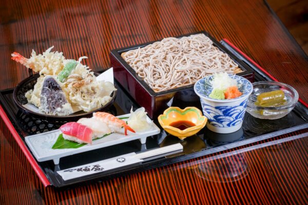 そばは岩手県産そば粉を使った二八そばで、本枯節と昆布からとった出汁、そして代々受け継がれてきた特製の返しが味の決め手。賢治が好んだ天ぷらそばと三ツ矢サイダーのセットや、白金豚カツ丼、ほろほろ鳥のせいろなど、メニューも豊富です。400席ある広い店内で、花巻の味と歴史にふれるひとときを楽しめます。