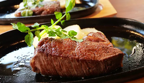 栃木県産の足利マール牛、とろける飛騨牛、希少な松阪牛など、選び抜かれた和牛ステーキを堪能できます。日光山椒ソース、地元醤油を使った和風ソース、濃厚な黒ごまソースの3種から選べる自家製ソースも好評で、肉の旨みをさらに引き立ててくれます。