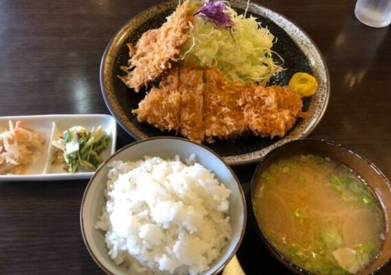 看板メニューは、岩中豚を使ったロースかつやヒレかつ。しっかりした厚みと甘みのある肉は、塩で食べると素材の旨味がより引き立ちます。イカフライやカキフライ、海老フライといったトッピングも人気で、ボリュームたっぷりの定食スタイルで楽しめます。ご飯の大盛りが無料なのも嬉しいポイント。地元の人に長く愛されてきた理由が伝わる一軒です。