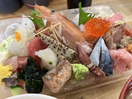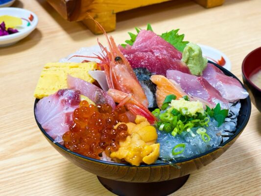沼津港の市場エリアに位置する「せきの」は、早朝から行列ができることもある人気の食事処です。朝6:00(土日は5:00の場合あり)から営業しており、港で働く人々だけでなく、早起きした観光客にとっても聖地のような場所。名物のアジフライは、身が厚くてふわふわの食感が楽しめると評判です。海鮮丼メニューも豊富で、その日に仕入れたばかりの新鮮なネタがこれでもかと盛り付けられています。活気ある港の雰囲気を感じながら、豪快な海の幸を朝からいただく体験は、沼津旅行のハイライトになるはず。朝一番の新鮮な味を堪能したいなら、ぜひ早起きして訪れてみてください。