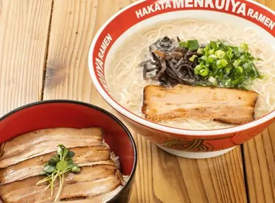JR博多駅筑紫口から徒歩約5分、博多駅東エリアに店を構える「めんくいや 博多駅東店」は、昭和55年創業の老舗豚骨ラーメン専門店です。薬院に本店を持ち、40年以上にわたり博多の激戦区で愛され続けてきた実力派。昼はラーメン店、夜は居酒屋スタイルで深夜まで営業しており、ビジネスマンの強い味方となっています。駐車場も2台完備しています。
