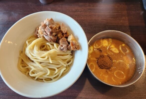 浦安市富士見にあるプルプル55は、名古屋大須のフジヤマ55の系列店で、極濃つけ麺が自慢の店です。豚骨魚介のWスープに魚粉がたっぷりとかかった濃厚なつけ汁が特徴で、モチモチの太麺がスープに絡みついて食べ応え抜群です。台湾まぜそばも人気メニューで、一度食べたらやみつきになる味わいです。各座席にIHコンロが設置されており、つけ汁を温め直しながら最後まで熱々で楽しめるのが嬉しいポイントです。生卵1個が無料でついてくるため、温玉にしたりつけ汁に溶かしたりとアレンジも自由自在です。カウンター9席のみのこぢんまりとした店ですが、場所柄恵まれているとは言えないながらも地元のつけ麺ファンから高い支持を得ています。舞浜エリアで本格的な極濃つけ麺を楽しみたい方におすすめの一軒です。