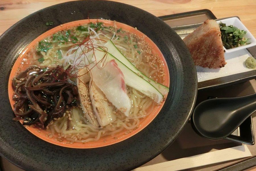 箱根湯本駅から徒歩3分、丸嶋ビル3階に位置する鯛ラーメン専門店。羅臼昆布をじっくり12時間かけて水出ししたお出汁に、鯛のアラを入れて圧力釜で炊いた、鯛の香り豊かなあっさりスープが自慢です。動物系素材を一切使用しないヘルシーな一杯は、女性客にも大好評。塩味と醤油味から選べます。人気の「鯛らーめんセット」は、麺を食べた後のスープに鯛めし焼きおにぎりと薬味を入れて鯛茶漬け風にして楽しめる二度美味しいメニュー。焼きおにぎりのおこげの歯応えとスープの組み合わせは絶品です。木を基調とした明るく清潔感のある店内で、ゆったりと食事を楽しめます。