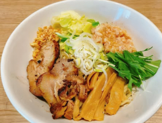 看板のまぜそばは、特製タレと香ばしい炭火焼きチャーシューが絡む力強い味わいが魅力です。基本のまぜそばに加えて、「得製まぜそば」や「台湾まぜそば」「七郎まぜそば」などのバリエーションが揃い、麺量も小〜特まで同一価格で楽しめるのが嬉しいポイント。味玉や辛味のトッピングで自分好みにカスタムするのもおすすめです。