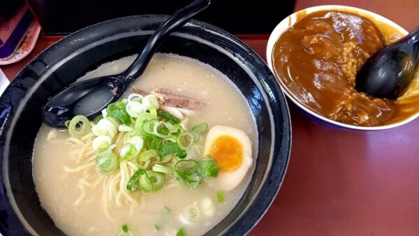 朝6時から営業しているラーメンショップ平内店は、朝ラーも楽しめる貴重なお店です。最大の魅力は、ラーメンを注文するとカレーライスが無料で食べ放題というサービス。ワカメ、ネギも無料でトッピングでき、ライスも無料というコストパフォーマンスの高さが人気です。自家製麺を使用したラーメンは豚骨醤油ベースで、麺の硬さや味の濃さ、背脂のトッピングなどカスタマイズも可能。駐車場が広く大型トラックも停められるため、ドライバーの方にも人気の店です。