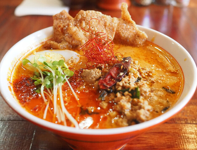 登別温泉街の中心部、登別温泉町76-14に位置する「閻魔軒」は、2023年にオープンした辛い系ラーメンの専門店です。店名通り、閻魔様をモチーフにした内装が特徴的で、店内には鬼たちの絵が飾られ、ウェイティングエリアも完備されています。看板メニューの閻魔少々汁有坦々麺は、ひき肉・ゆで卵・ピーナッツ・クコの実・松の実・かいわれがトッピングされた本格的な一杯。舌がピリピリする辛さから始まり、徐々にヒーヒーする辛さへと変化していく、辛党にはたまらない味わいです。辛くないメニューも4種類用意されており、辛いものが苦手な方でも楽しめます。カウンター席のみの店内は、荷物入れも完備されており一人客でも利用しやすい雰囲気。価格帯は900円から1,500円程度で、クレジットカード・電子マネー・QRコード決済にも対応しています。
