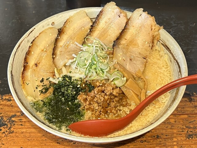 国道6号線沿い、日立木駅近くに位置する「麺龍」は、三種類の味噌ラーメンが自慢のお店です。白味噌、赤味噌、黒味噌の三つから選べる味噌ラーメンは、それぞれ異なる風味を楽しめます。特に人気の白味噌ねぎラーメンは、あっさりとした中にもコクがあり、もちもちの中太ストレート麺との相性も抜群です。黒味噌は八丁味噌ベース、赤味噌は辛味噌がアクセントになっており、味変を楽しみながら最後まで飽きずに食べられます。広々とした店内は座敷席もあり、家族連れにも人気。提供スピードが速いのも魅力で、体感5分ほどで着丼するとの声も。ニラや高菜などのトッピングも充実しており、自分好みにカスタマイズできる楽しさがあります。相馬と南相馬の境目付近という立地で、ドライブ途中の食事にも最適です。