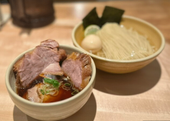 昆布水に浸した自家製麺は、まずはそのまま食べて小麦の香りと旨みを堪能。その後、鰹と昆布出汁の効いた上品な醤油ベースのつけ汁にくぐらせて味の変化を楽しめます。特製つけ麺にはチャーシュー、味玉、海苔などが贅沢にトッピングされ、見た目にも美しく満足感のある一杯。素材の旨味を最大限に引き出した繊細な味は、つけ麺ファンはもちろん、初めての方にもおすすめです。