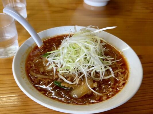 勝浦駅から徒歩5分ほどの場所にある「てっぱつ屋」は、ユニークなコンテナ風の外観が目を引くお店です。勝浦店と佐野店の2店舗を展開しており、どちらも地元で人気を集めています。こちらの勝浦タンタンメンは、やや太めのもちもち麺が特徴で、他店とは一線を画す食感が楽しめます。スープはサラサラしたタイプで辛めの仕上がり。真っ赤なラー油がたっぷりで、辛さと旨味が口いっぱいに広がります。穴あきレンゲが付いてくるので、玉ねぎや挽肉などの具材をしっかり楽しめるのも嬉しいポイント。勝浦駅からも近く、観光客にもアクセスしやすい立地が魅力です。