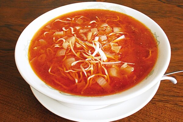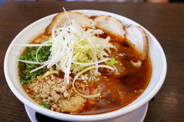 勝浦タンタンメンを語る上で欠かせないのが、この「江ざわ」です。昭和29年創業という歴史を持ち、勝浦タンタンメン発祥の店として知られています。初代店主が四川担担麺を再現しようとした際、当時入手困難だった芝麻醤の代わりに自家製ラー油と玉ねぎを使用したことで、独特の「勝浦式担々麺」が誕生しました。醤油ベースのピリ辛スープに、鶏や豚、魚介からとったダシと自家製タレをブレンド。表面を覆う真っ赤な自家製ラー油は、ほのかに甘い玉ねぎと挽肉との相性が抜群です。辛さの中に深みのある味わいがクセになり、行列覚悟の人気店として県内外から多くのファンが訪れます。冬季限定の「もつ担々」も見逃せません。