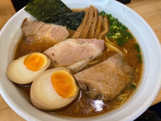 南伊豆では珍しいラーメン専門店として地元の人々にも愛される人気店です。豚骨に魚介系のダシを合わせたコクがありながらもクセのないスープが特徴で、最後まで飲み干せる美味しさです。看板メニューの「真らーめん」は店主が東京のラーメン店で修行を重ね、試行錯誤の末に完成させたオリジナルの一品。モッチリとした中太麺がスープとよく絡み、自家製のやわらかいチャーシューと味がしっかり染み込んだ半熟煮玉子がトッピングされています。木曜日限定で醤油味と塩味の「健らーめん」も提供されており、冬季には1日30食限定の味噌らーめんも楽しめます。ランチタイムには無料でライスが付くのも嬉しいサービス。カウンター席のほか、4人掛けのテーブル席や小さな座敷もあり、家族連れでも安心です。スープがなくなり次第閉店となるため、早めの訪問がおすすめです。