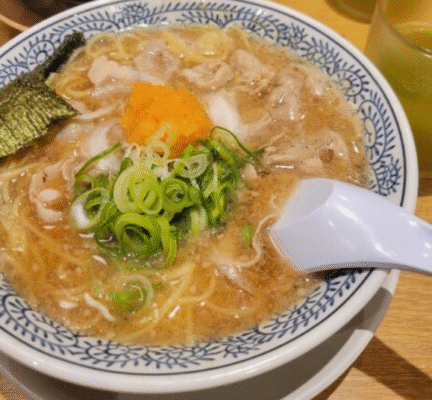 丸源ラーメン 明石店は、明石市大久保町にある全国展開の人気ラーメンチェーンです。名物として知られる「熟成醤油ラーメン 肉そば」を中心に、幅広い世代に親しまれる安定感のある味わいが特徴。スープはコクがありながらも重すぎず、薄切りの豚肉と柚子胡椒おろしがアクセントとなり、最後まで飽きずに楽しめる一杯に仕上がっています。