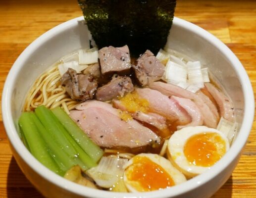 鴨と鶏をベースにしたスープは、あっさりとしながらも深みのある味わいで、まるで高級中華のような上質な一杯。醤油と塩の2種から選べるスープに、しっとりとした鴨チャーシューが贅沢にトッピングされています。さらに、トリュフ香る「特製そば」や、見た目にも美しい限定メニューも人気。ミニごはんや味玉とのセットで満足感もアップ。錦糸町で落ち着いて美味しいラーメンを楽しみたいときに訪れたいお店です。