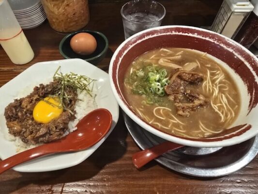 徳島市内で圧倒的な知名度を誇る「ラーメン東大 大道本店」は、ラーメン界の頂点を目指すという意味を込めて名付けられた人気店です。県内外に12店舗を展開する東大グループの本店として、連日多くの客で賑わっています。骨からじっくり炊き出した濃厚な醤油とんこつスープに、東大特注の中細ストレート麺がよく絡む一杯は、徳島ラーメンの王道を行く味わい。最大の特徴は、創業当時から続く生卵無料サービス。卓上に置かれた徳島県産の新鮮な生卵は何個でも使い放題で、ラーメンに入れるのはもちろん、卵かけご飯として楽しむこともできます。さらに大道本店限定で、ラーメンを注文すると無限ライスが付いてくる太っ腹サービスも!甘辛く煮込まれた豚バラ肉をご飯にのせて食べれば、まさに至福のひととき。年中無休で朝4時まで営業しているため、飲んだ後の〆の一杯にも最適です。徳島駅から徒歩約15分とアクセスも良好です。