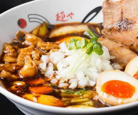 名物は「特製スタミナホルモンラーメン」。「黒」は甘辛な醤油ベースで、ホルモンのコクがじんわり広がります。自家製のレアチャーシュー、煮卵、ホルモン大盛りがのる贅沢仕様で、こってり系でも後味はキレよくまとまっています。具材が多いので、食べ進めるほど満足感が増します。まずはそのまま、途中で薬味を絡めて味変、最後は残ったスープにごはんを入れて〆るのもおすすめです。大阪でガツンと満足できるラーメンを探している人に刺さります。