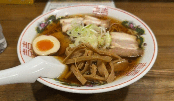 看板は醤油ベースのラーメンで、濃い色合いながら角のない口当たりが魅力です。つるっと食べ進めやすい麺に、チャーシューやメンマ、海苔、ねぎが寄り添うシンプルな構成で、最後まで飽きにくいまとまり。ワンタンやチャーシューのトッピングで満足感を上げたり、焼きそばを合わせて“食堂気分”を楽しむのもおすすめです。