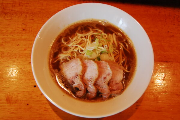 魚介と動物系のダブルスープが特徴で、濃厚ながらも後味はすっきり。やや太めのストレート麺がスープとよく絡み、食べ応え抜群です。看板メニューの「ちゃあしゅう麺」は、肩ロースとバラの2種類のチャーシューがこれでもかと盛られた圧巻のビジュアル。「半ミックス肉麺」なら両方の部位を一度に楽しめます。卓上に用意された刻み玉ねぎと魚粉は3杯まで無料でトッピング可能。味変しながら最後まで飽きずに完食できます。