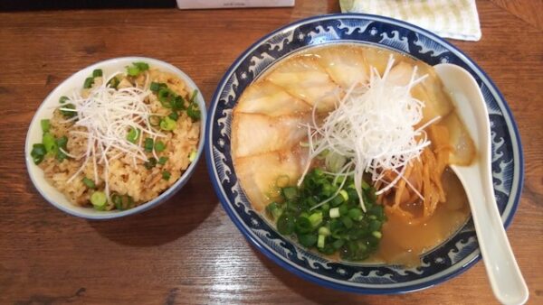 看板メニューの「魚介豚骨ラーメン」は、魚介の風味と豚骨のコクがバランスよく合わさった仕上がりで、濃厚ながら重たくなりすぎない味わいが特徴。魚介まぜそばやガーリックライスなどのサイドメニューもあり、組み合わせ次第で満足感のある食事が楽しめます。昼限定で、質の高い一杯を味わいたい人におすすめしたい一軒です。