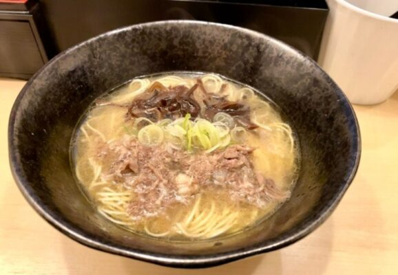 メニューはラーメンとチャーシューメン、おにぎりなどシンプルな構成で、豚骨ベースのスープは比較的あっさりとした口当たりが特徴です。卓上には辛子高菜や紅しょうがが置かれており、好みで加えるとぐっとパンチのある味わいに変化します。小倉で気取らない一杯を楽しみたいときに、覚えておきたい一軒です。