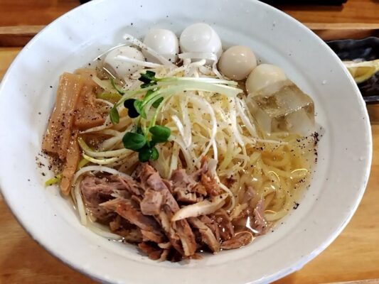 ラーメンは、素材の持ち味を最大限に引き出した澄んだスープと、しなやかな細麺が特徴。派手さを前に出すのではなく、香り・旨み・後味の余韻まで計算された構成で、食べ進めるほどに完成度の高さを実感できます。塩ラーメンをはじめ、時期ごとに提供される限定麺もあり、訪れるたびに新しい味わいと出会えるのも魅力です。
