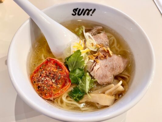 2025年12月に出雲市今市町にオープンした「ラーメンSUN !」は、静岡県の名店「ラーメンろたす」で修業した店主が地元出雲に帰郷して開いた注目の新店です。これまでイベント出店などで人気を博してきましたが、待望の路面店としてスタート。看板メニューの「ローストトマト塩ラーメン」は、無化調(化学調味料不使用)の透き通ったスープに、ローストトマトをトッピングした独創的な一杯。トマトの酸味とハーブがスープに溶け出し、食べ進めるごとに旨味が増していく味わいが特徴です。一方で「豚そば」は、ワシワシの極太麺に背脂とたっぷり野菜を乗せた二郎系のガッツリラーメン。体に優しい無化調ラーメンから中毒性のあるガッツリ系まで、幅広いニーズに応える新世代のラーメン店です。