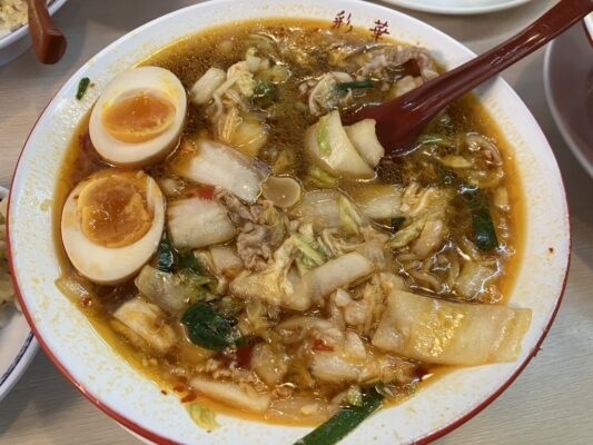 奈良県民のソウルフードとも言える彩華ラーメンの橿原店です。国道166号線沿いに位置し、テント張りの店内は屋台から始まったこの系列店の歴史を感じさせます。にんにくと辣油がガツンと効いたピリ辛醤油スープに、たっぷりの白菜がトッピングされたスタミナラーメンが看板メニューです。細麺はスープとの相性が抜群で、深夜まで営業しているため夜遅くに食べたくなった時にも安心です。広々とした店内には座敷席もあり、家族連れでも利用しやすいお店です。スタミナをつけたい時、がっつり食べたい時に最適な一杯が楽しめます。