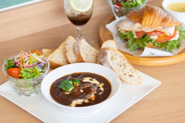 標高約350メートルの高台に位置する「ベーカリー&テーブル Sweets伊豆」は、伊豆ホテル リゾート&スパ内にあるベーカリーカフェです。太平洋と伊豆諸島を一望できる絶景が最大の魅力で、テラス席には熱川温泉の足湯カウンター席も用意されています。足湯に浸かりながら海を眺め、焼きたてのパンやスイーツを楽しむという贅沢なひとときが過ごせます。ランチメニューでは、発酵バターを使用したサクサク食感のクロワッサンサンドが人気で、新鮮な野菜がたっぷり挟まれたボリューム満点の一品です。ランチセットにはスープとサラダも付いています。伊豆をはじめ静岡のフルーツをふんだんに使用したパティシエ特製スイーツも充実しており、カフェタイムにもおすすめです。2020年オープンの比較的新しいお店で、日帰りでも気軽に利用できます。