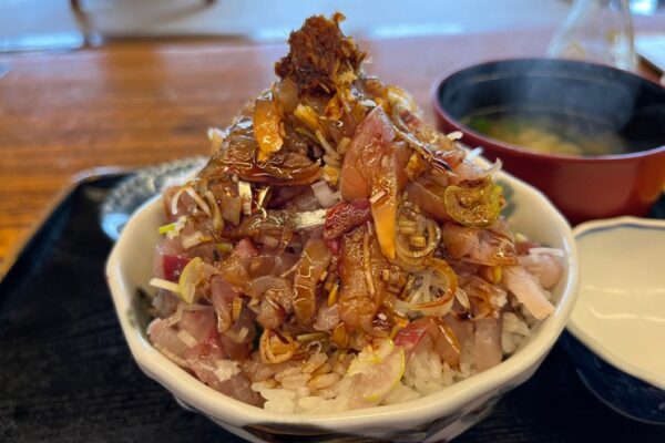 国道135号線沿い、伊豆の海を見晴らす絶景ロケーションにある「大衆磯料理 磯辺」は、大将と女将さん、お母さんの3人で営む家庭的な磯料理店です。店内は昔ながらの磯料理屋の雰囲気で、大きく分厚い木のテーブルが印象的です。窓の向こうには太平洋が広がり、座敷席からは絶景を眺めながら食事が楽しめます。名物の「あじ丼」は、丼から溢れるほどの新鮮なアジが山盛りにのっており、少し甘めの醤油ダレがかかったボリューム満点の一品です。ほかにも、大トロ、中トロ、アワビ、イクラ、金目鯛、カンパチなど、新鮮な魚介類がふんだんに盛り付けられた「ミックス丼」も人気で、その豪華さはまるで海鮮の宝石箱のようです。金目鯛の煮付けや地魚のフライ定食など、定食メニューも充実しています。地元の釣り師に愛される老舗で、気取らない家族的な雰囲気が魅力です。