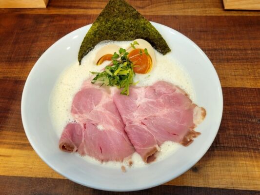 奈良で行列ができることで知られる人気店「みつ葉」の2号店として、2017年に法隆寺近くにオープンしたラーメン店です。最大の特徴は、エスプーマで泡立てた独特の泡系スープ。国産の豚骨と鶏ガラのダブルスープに、貝柱や昆布を使った塩ダレを合わせており、見た目はポタージュスープのようながら口に含むとふんわりとした独特の食感が広がります。麺はもちもちの多加水自家製麺で、中太麺と全粒粉入り平打ち麺から選べます。低温調理したレアチャーシューはローストビーフのようなジューシーさで、材木メンマも下味がしっかりと抜群の美味しさです。豚CHIKIしおと豚CHIKIしょうゆの2種類があり、どちらも食べログラーメンWEST百名店に選ばれた実力派の味です。
