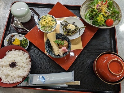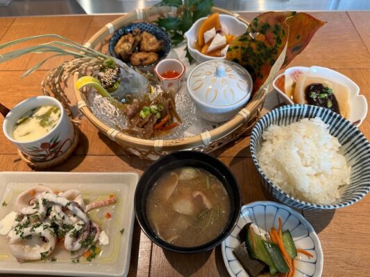 皆生温泉エリアにある和と洋が融合したお店です。ランチタイムには前菜5種とメイン1品、ご飯、みそ汁、コーヒーがセットになった花かご膳が人気を集めています。淀江産のお米や契約農家から仕入れた野菜、境港産のお魚など地元食材をふんだんに使用し、一品一品丁寧に作られた料理が華やかに盛り付けられています。パンとデザートは米子市の人気店CAFE&BAKERY APLICOから仕入れているというこだわりも。ディナータイムには大山ぶたや大山どりを使った一品料理やコース料理も楽しめます。明るく気さくなスタッフの対応も評判で、料理の説明を丁寧にしてくれるので、より一層食事を楽しめます。皆生温泉での滞在中、特別な食事時間を過ごしたい方におすすめのお店です。