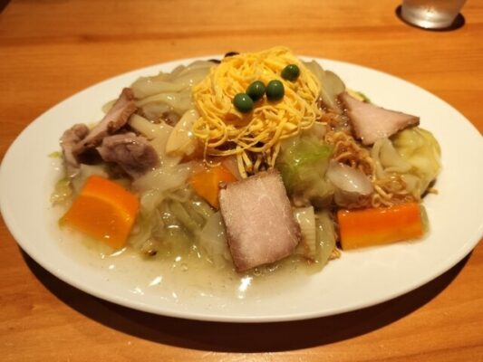 大正13年創業、信州のあんかけ焼きそば文化のルーツとされる老舗中華料理店です。名物は極細ちぢれ麺を香ばしく焼き上げ、野菜の甘みが凝縮した上品なあんをのせた五目焼きそば。低温でじっくり揚げるため提供まで時間がかかりますが、待つ価値のある一品です。辛子酢をかけてさっぱりといただくのが上田流。三代目店主が一子相伝で受け継ぐ伝統の味は、上田市民のソウルフードとして親しまれています。ラーメンやわんたんなどのセットメニューもあり、ディナーにも人気です。店内は清潔で、上田駅から徒歩圏内の好立地にあります。