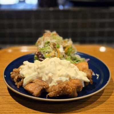旦過駅から徒歩約4分、馬借にある食堂百名店2024に選出された人気店です。名物のチキン南蛮定食は、揚げたての鶏もも肉を甘酢に漬け込み、自家製のたっぷりタルタルソースをかけた一品で、サクサクの衣とジューシーなお肉の組み合わせが絶品です。ご飯は国産米を使用し、炊き具合も抜群。定食には小鉢や味噌汁、漬物が付き、小鉢の内容は日替わりで楽しみのひとつです。夜は居酒屋としても利用でき、ハイボールと一緒にチキン南蛮を楽しむ地元客も多く見られます。ディナータイムも定食メニューが充実しており、北九州での食事におすすめのお店です。