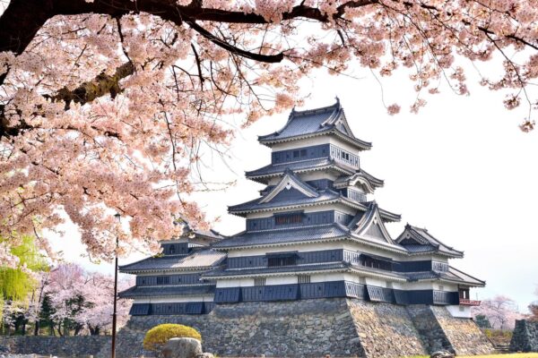 長野県松本市に位置する国宝松本城は、春になると約300本の桜が城郭や本丸庭園を彩り、昼夜問わず美しい景観を楽しめる桜の名所です。特に開花宣言の3日後から8日間は「夜桜会」が開催され、天守や本丸庭園の桜がライトアップされるため、昼間とは異なる幻想的な雰囲気の中で花見を堪能できます。また、外堀沿いの桜並木もライトアップされる「光の回廊」も見どころで、城と桜のコントラストは写真映え抜群です。園内は散策路が整備されており、ゆったり歩きながら桜を眺めることができ、歴史ある城と春の風景を同時に楽しめます。桜の見頃は例年4月上旬で、周辺には松本市街の観光スポットやグルメも点在しており、観光と花見を一緒に楽しめるのも魅力です。昼間の青空と桜、夜のライトアップと、時間帯によって表情を変える松本城の桜は、長野県を代表する春の絶景スポットとして、多くの人々を魅了しています。