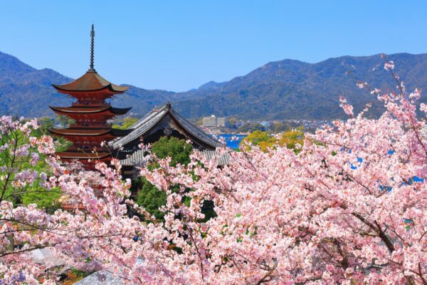 広島県廿日市市に浮かぶ宮島は、世界文化遺産・嚴島神社で知られる歴史的な島で、春には島全体に約1900本もの桜が咲き誇り、観光客や地元の人々に愛される桜の名所です。山桜、ソメイヨシノ、しだれ桜、大島桜など多彩な品種が見られ、歴史ある神社や朱色の多宝塔と桜のコントラストは、写真映えする絶景スポットとしても人気です。桜の季節には大元公園や誓真大徳碑周辺も見どころとなり、島内を散策しながら春の息吹を存分に感じられます。昼間は青空に映える桜と神社の景色を楽しみ、夕暮れ時には柔らかい光に包まれる桜の風情を満喫できます。また夜にはライトアップされ、幻想的な夜桜を眺めながら厳かな神社の雰囲気を味わうことができ、昼夜それぞれの魅力を楽しめます。桜の見頃は例年3月下旬から4月上旬で、フェリーでアクセスする宮島ならではの、海と桜が織りなす特別な景観を満喫できます。
