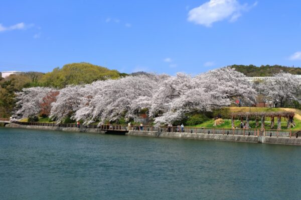 倉敷市にある酒津公園は、高梁川の配水池の堤に整備された総合公園で、「水と桜」をテーマに四季折々の景観を楽しめる市民憩いのスポットです。園内には約500本のソメイヨシノや八重桜が咲き誇り、春になると水面に映る桜や遊ぶカモを眺めながら、ゆったりと散策を楽しめます。例年3月下旬から4月中旬にかけて満開を迎え、春の穏やかな空気とともに桜の景色を満喫できます。さらに夜にはライトアップが行われ、昼間とは違った幻想的な夜桜を楽しむことも可能で、家族連れやカップル、写真愛好家に人気です。園内の広々とした遊歩道や芝生広場は散策や休憩に適しており、春のピクニックや写真撮影にも最適です。市内中心部からのアクセスも良く、公共交通機関や車で気軽に訪れることができるため、岡山県内でも指折りの桜名所として多くの人々に親しまれています。昼間の桜、川面に映る桜、そしてライトアップされた夜桜と、時間帯によって変化する美しい風景が楽しめるのも魅力です。