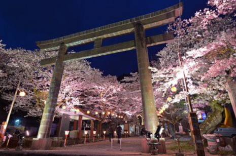 例年4月上旬から中旬にかけて見頃を迎え、夜にはライトアップが行われることで、昼間とはまったく異なる幻想的な表情を見せてくれます。ライトに照らされた満開の桜が境内を彩る光景は圧巻で、夜桜を目当てに多くの観光客が訪れます。温泉街の散策とあわせて立ち寄れるのも、大きな魅力のひとつです。